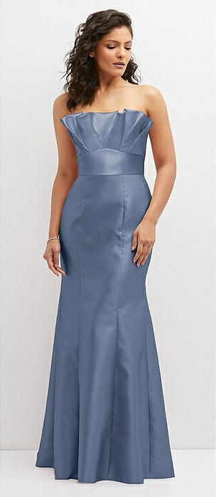 Strapless Pleated Faux Wrap Trumpet Gown with Front Slit in larkspur blue