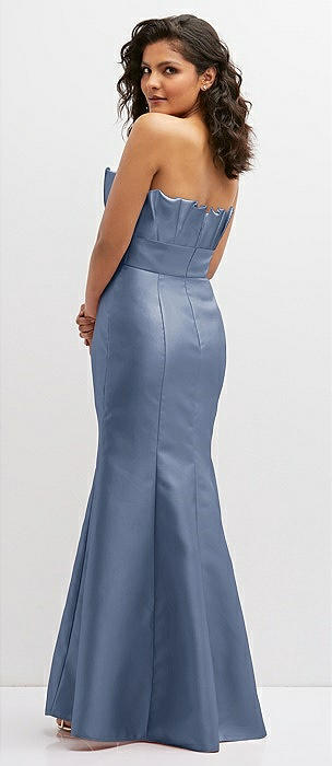 Basque-Neck Strapless Satin Gown with Mini Sash in larkspur blue