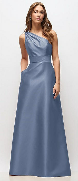 Draped One-Shoulder Satin Maxi Dress with Pockets in larkspur blue