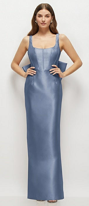 Scoop Neck Corset Satin Maxi Dress with Floor-Length Bow Tails in larkspur blue