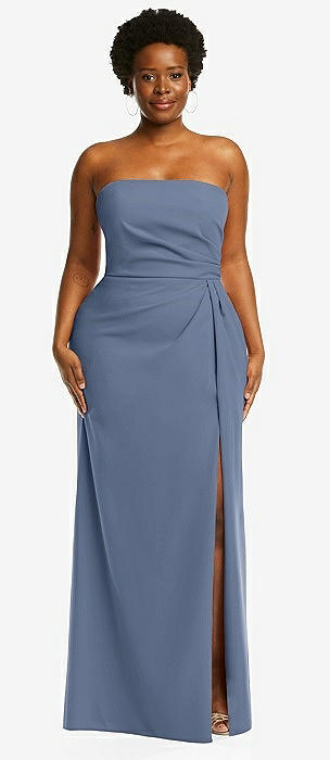 Strapless Pleated Faux Wrap Trumpet Gown with Front Slit in larkspur blue