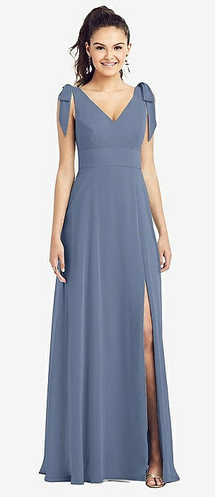 Bow-Shoulder V-Back Chiffon Gown with Front Slit in larkspur blue