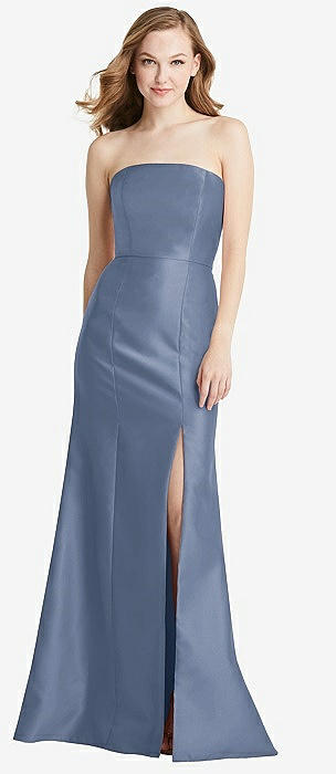 Strapless Shirred Chiffon Trapeze Maxi Dress in larkspur blue