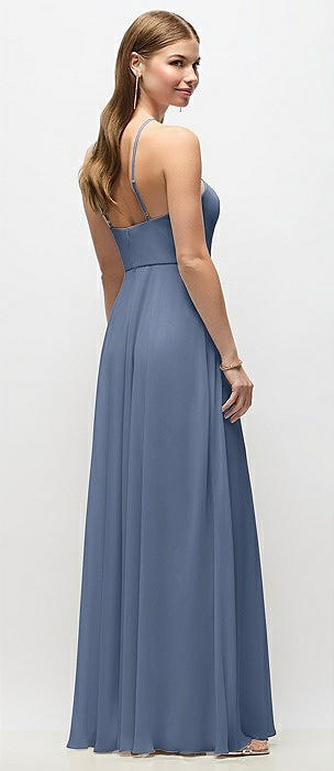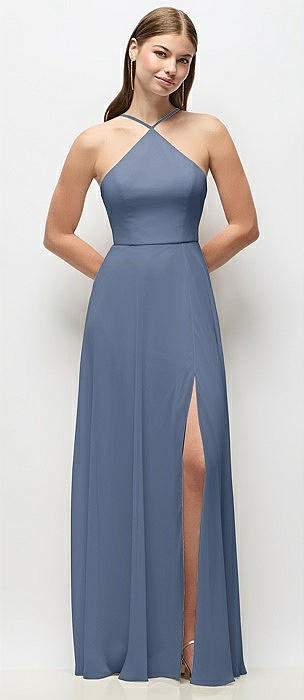 High-Neck Halter Chiffon Maxi Dress with Adjustable Spaghetti Straps in larkspur blue