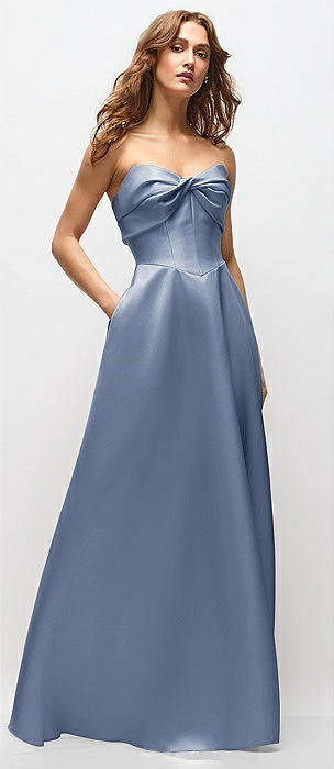 Strapless Twist Cuff Neck Satin Maxi Dress with Basque-Waist & Full Skirt in larkspur blue
