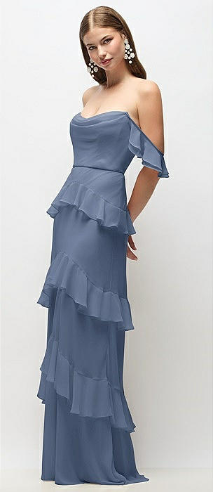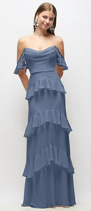 Off-the-Shoulder Cowl Chiffon Tiered Ruffle Maxi Dress with Convertible Ruffle Straps in larkspur blue