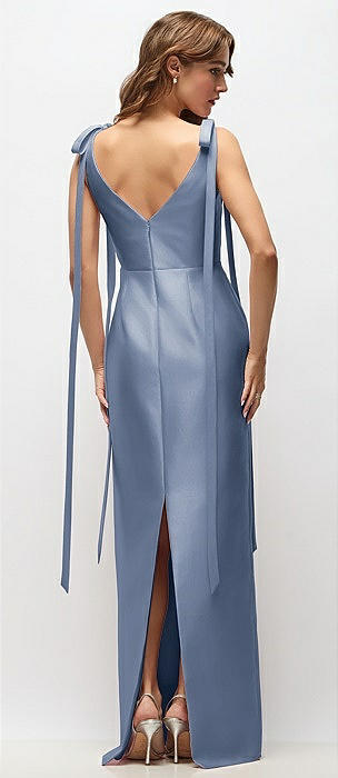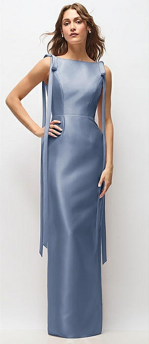 Bateau Neck Satin Column Maxi Dress with Exaggerated Tail Bow Straps in larkspur blue