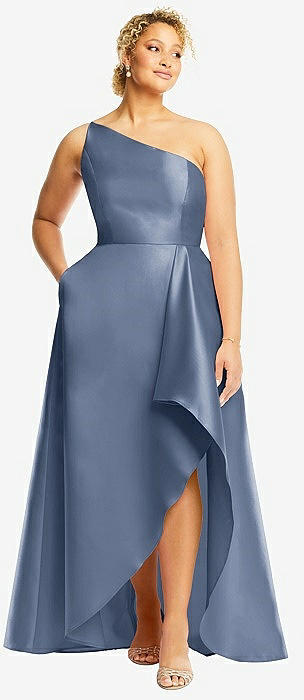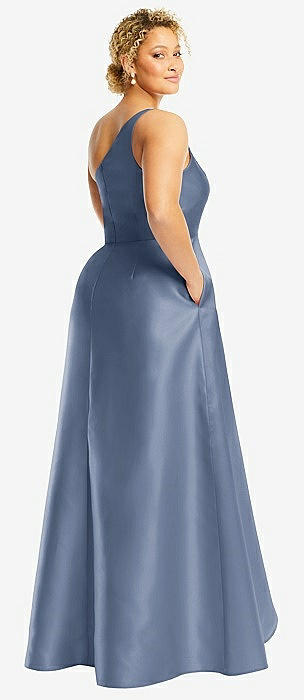 One-Shoulder Satin Gown with Draped Front Slit and Pockets in larkspur blue