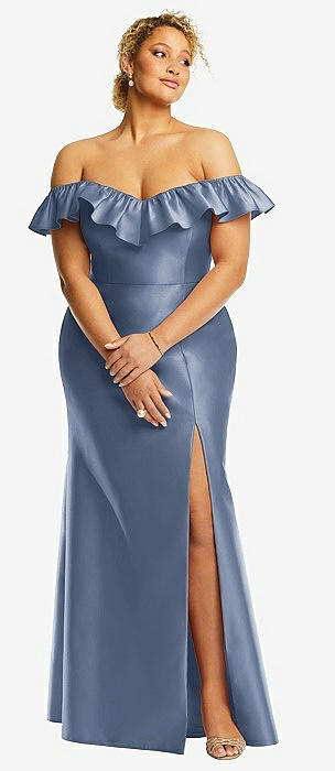 Off-the-Shoulder Ruffle Neck Satin Trumpet Gown in larkspur blue