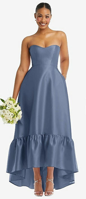 Strapless Deep Ruffle Hem Satin High Low Dress with Pockets in larkspur blue
