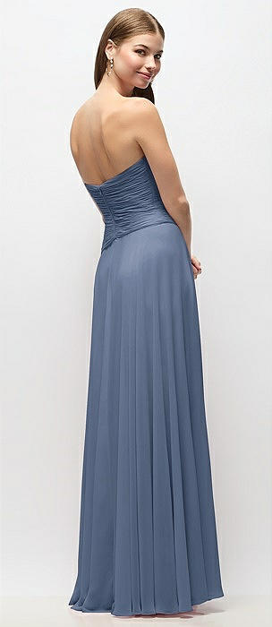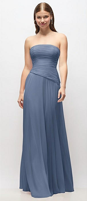 Strapless Chiffon Maxi Dress with Asymmetrical Ruched Drop Waist in larkspur blue
