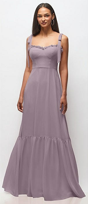 Tie-Shoulder Bustier Bodice Ruffle-Hem Maxi Dress in lilac dusk