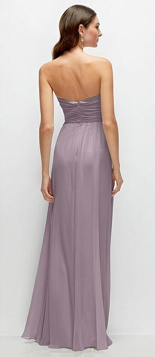 Strapless Chiffon Maxi Dress with Asymmetrical Ruched Drop Waist in lilac dusk