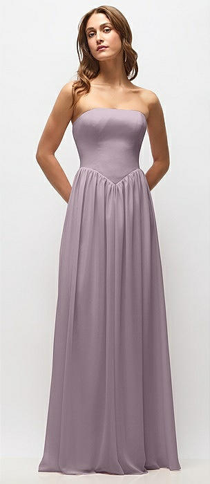 Strapless Basque Drop Waist Chiffon Maxi Dress with Shirred Skirt in lilac dusk