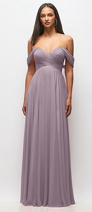 Off-the-Shoulder Draped Chiffon Maxi Dress in lilac dusk