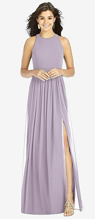Shirred Skirt Jewel Neck Halter Dress with Front Slit in lilac haze