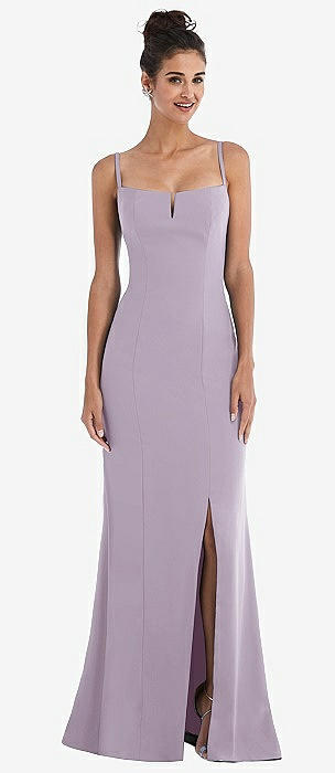 Notch Crepe Trumpet Gown with Front Slit in lilac haze
