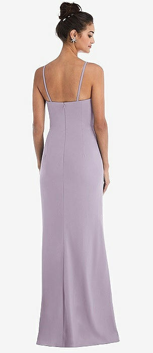 Cowl-Neck Wide Strap Crepe Trumpet Gown with Front Slit in lilac haze