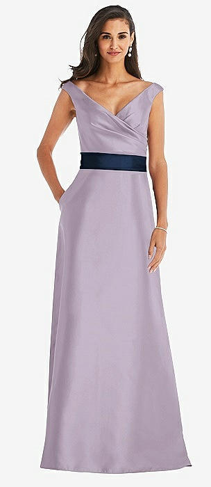 Off-the-Shoulder Criss Cross Back Trumpet Gown in lilac haze
