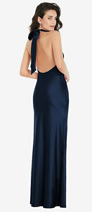 Cowl-Neck Open Tie-Back Stretch Satin Mermaid Dress with Slight Train in midnight navy