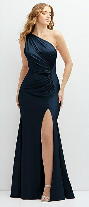Asymmetrical Open-Back One-Shoulder Stretch Satin Mermaid Dress in midnight navy
