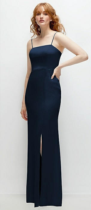 Spaghetti Strap Draped Skirt Gown with Front Slit in midnight navy