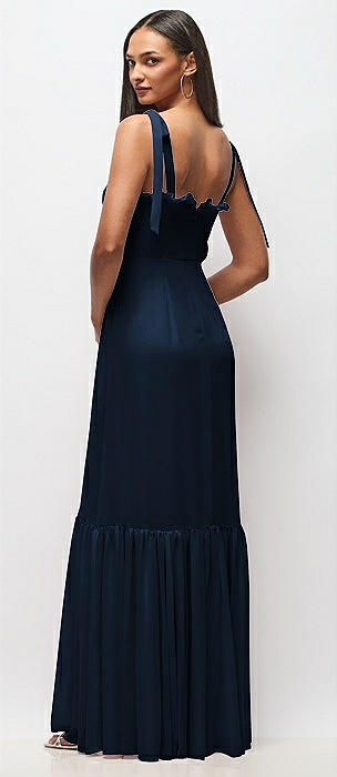 Tie-Shoulder Bustier Bodice Ruffle-Hem Maxi Dress in midnight navy