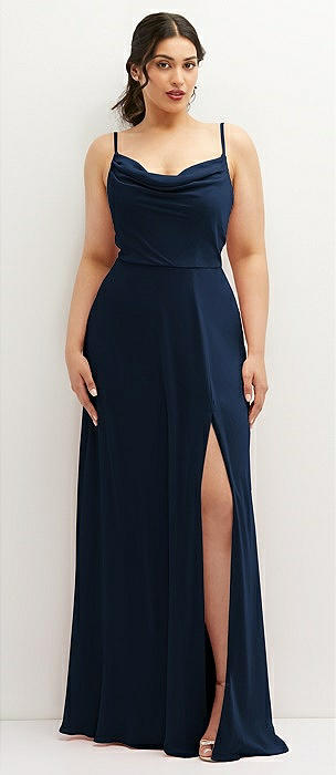 Cowl-Neck Wide Strap Crepe Trumpet Gown with Front Slit in midnight navy