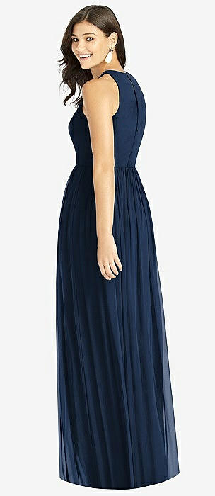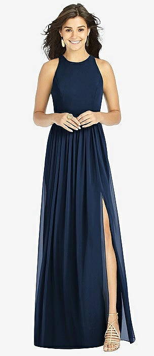 Shirred Skirt Jewel Neck Halter Dress with Front Slit in midnight navy