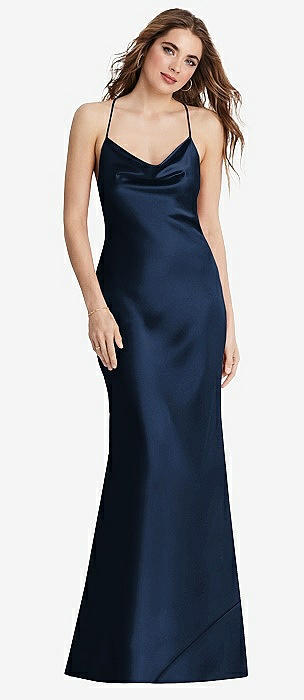 Cowl-Neck Open Tie-Back Stretch Satin Mermaid Dress with Slight Train in midnight navy
