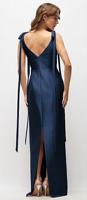Bateau Neck Satin Column Maxi Dress with Exaggerated Tail Bow Straps in midnight navy