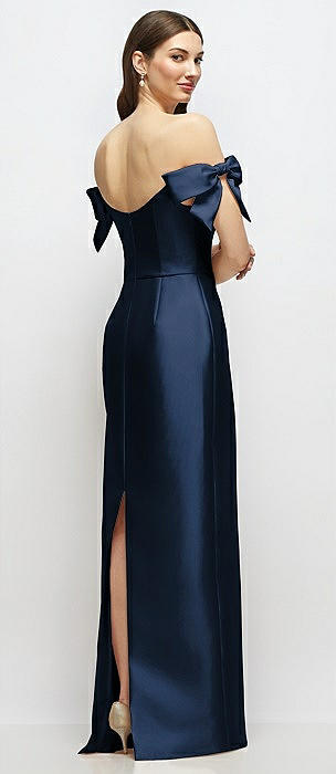 Basque-Neck Satin Column Maxi Dress with Off-the-Shoulder Bows in midnight navy