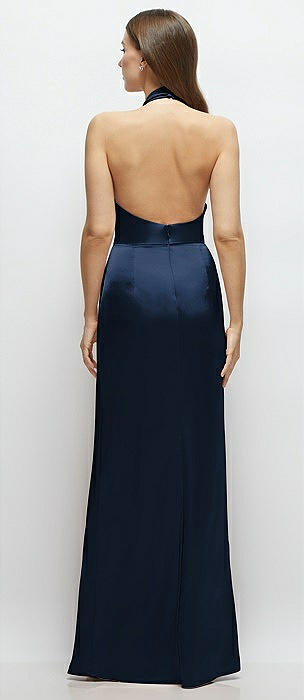 Deep V-back Satin Trumpet Dress with Cascading Bow at One Shoulder in midnight navy