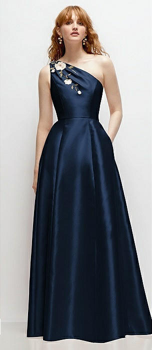 One-Shoulder Full A-Line Satin Gown with Handworked Floral Appliqué in midnight navy