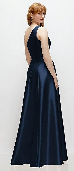 One-Shoulder Cat-Eye Neckline Fit and Flare Satin Maxi Dress in midnight navy