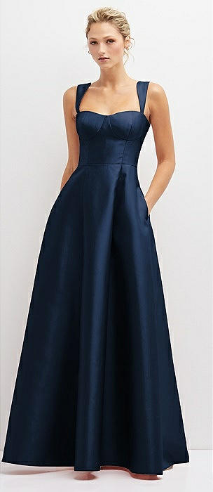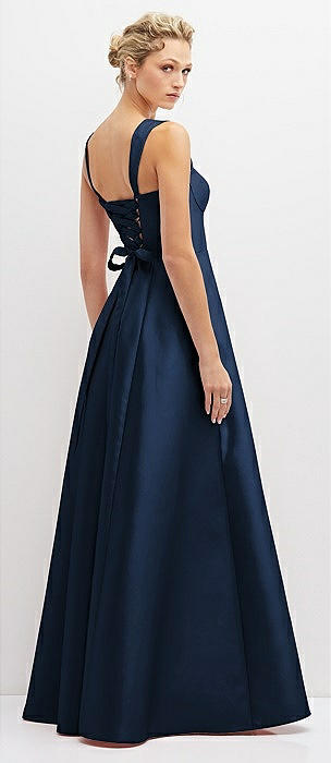 Lace-Up Back Bustier Satin Dress with Full Skirt and Pockets in midnight navy