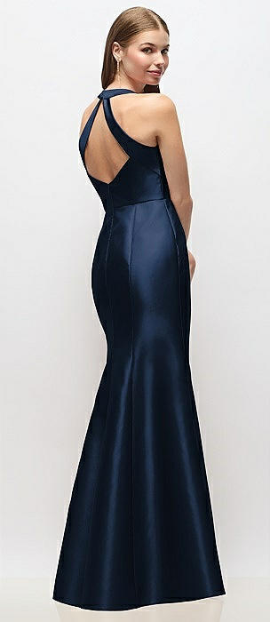 V-Neck Halter Satin Trumpet Gown in midnight navy