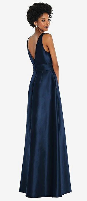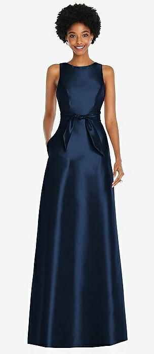 Open Neckline Cutout Satin Twill A-Line Gown with Pockets in midnight navy