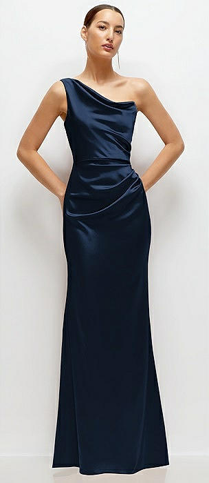 One-Shoulder Cat-Eye Neckline Fit and Flare Satin Maxi Dress in midnight navy