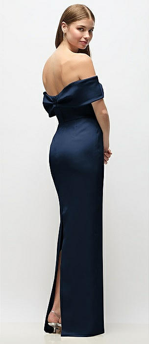 Off-the-Shoulder Bow-Back Satin Trumpet Gown in midnight navy