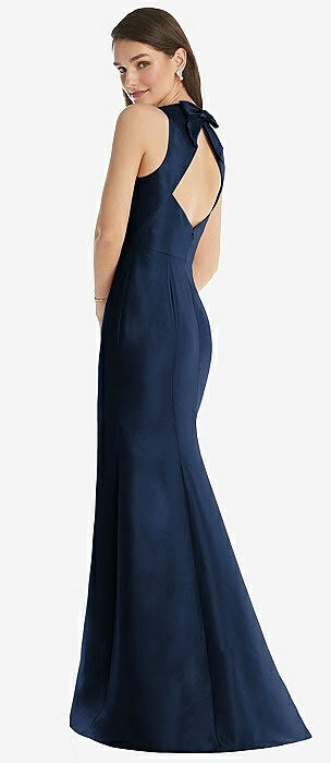 Sleeveless Satin Trumpet Gown with Bow at Open-Back in midnight navy