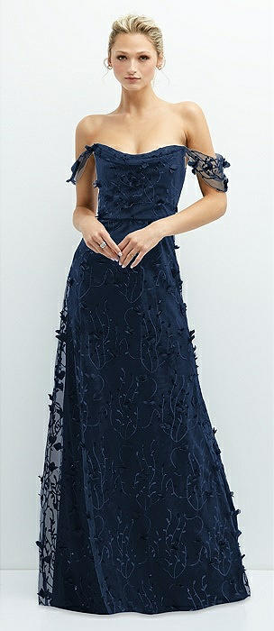 Off-the-Shoulder A-line 3D Floral Embroidered Dress in midnight navy