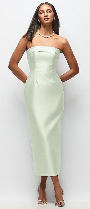 Strapless Cuff Satin Midi Dress with Column Skirt & Back Bow in mint green