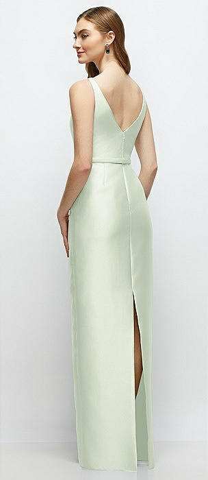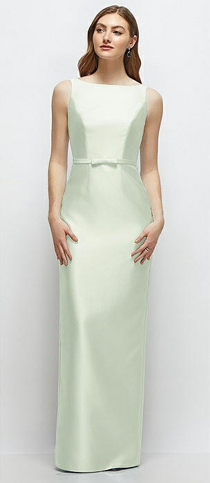 Bateau Neck Satin Column Dress with Bow-Trimmed Skinny Belt in mint green