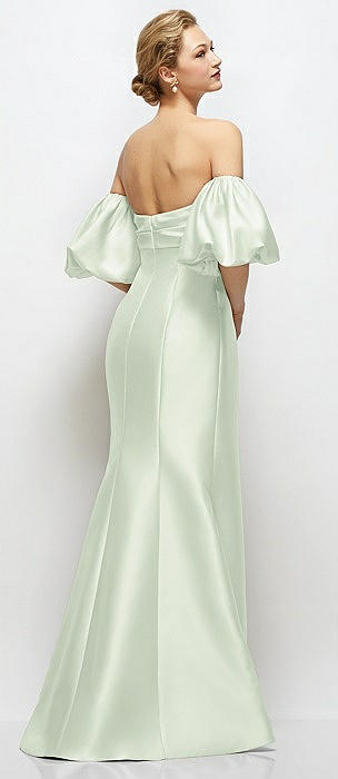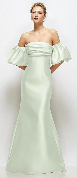 Off-the-Shoulder Puff Sleeve Satin Maxi Dress with Flared Skirt in mint green
