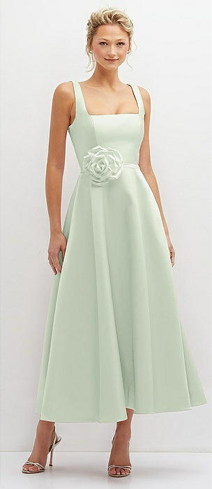 Scoop Neck Satin Column Midi Dress with Bow at Empire Waist in mint green