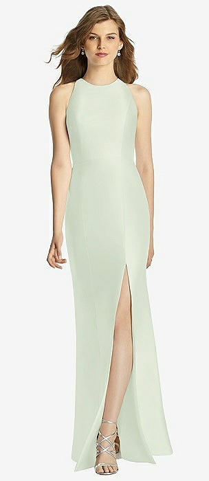 Shirred Skirt Jewel Neck Halter Dress with Front Slit in mint green