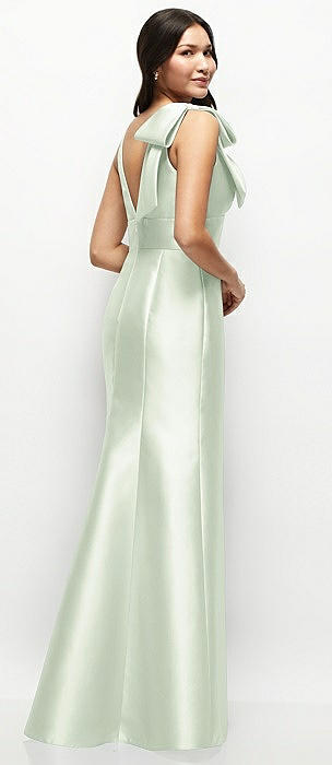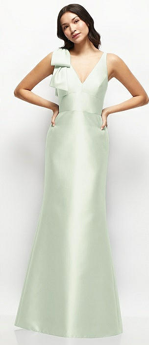 Deep V-back Satin Trumpet Dress with Cascading Bow at One Shoulder in mint green