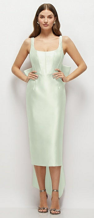 Scoop Neck Corset Satin Midi Dress with Floor-Length Bow Tails in mint green