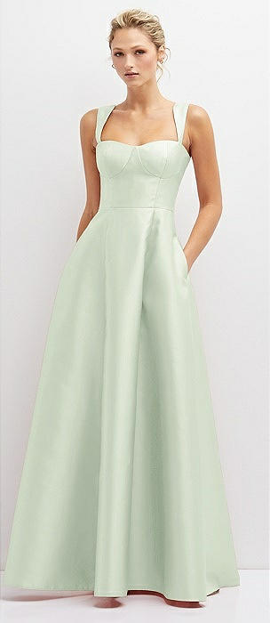 Boned Corset Closed-Back Satin Gown with Full Skirt and Pockets in mint green